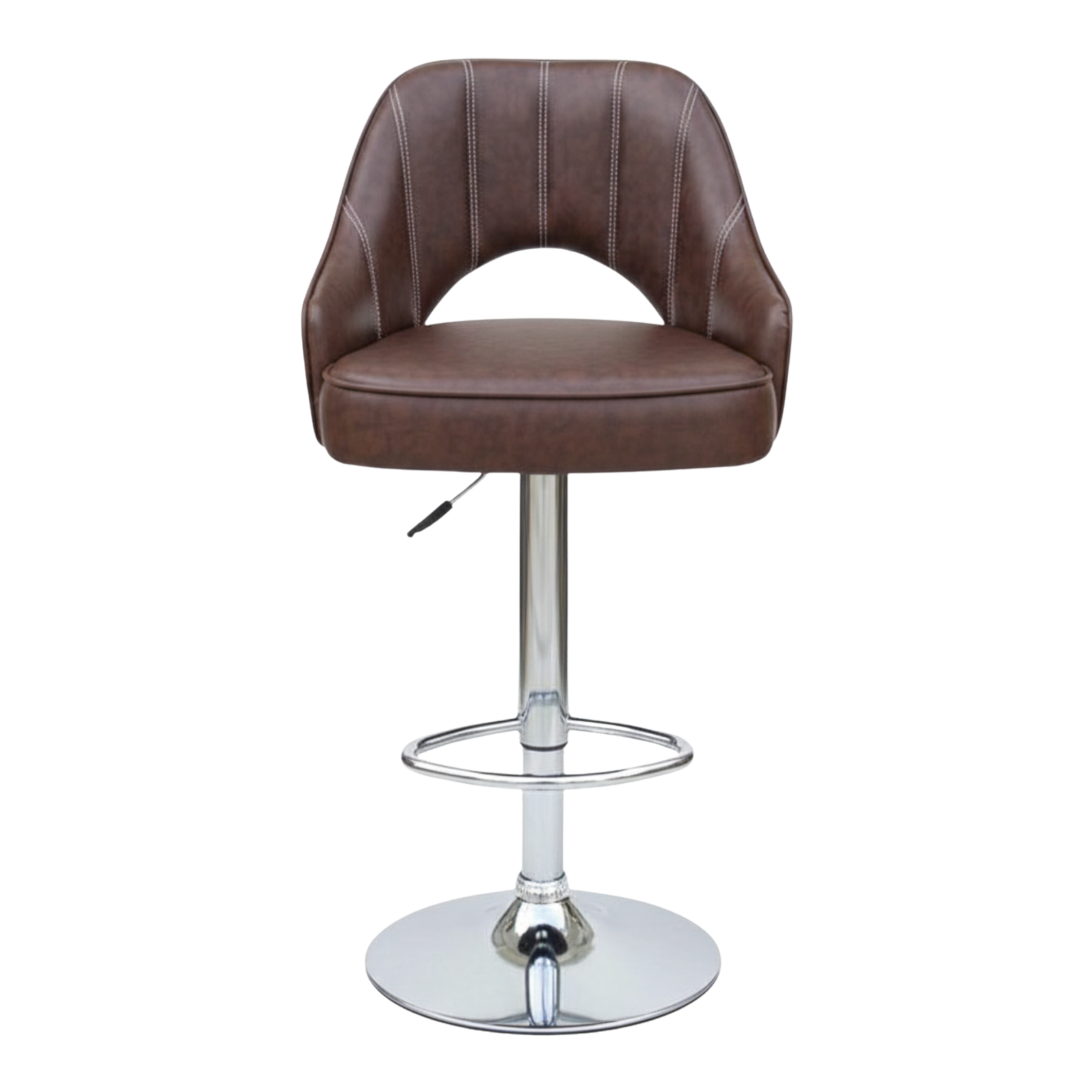 Add a refined touch to your kitchen counter or bar area with this modern counter stool. The rich brown upholstered seat brings warmth, while the smooth stitching and curved backrest give it a polished look. Designed for everyday comfort, the padded seat and supportive back make it easy to sit longer, whether you are having coffee or hosting guests. The chrome base adds a contemporary contrast and keeps the stool stable and durable. It is a great fit for modern kitchens, home bars, cafes, or reception counters.
